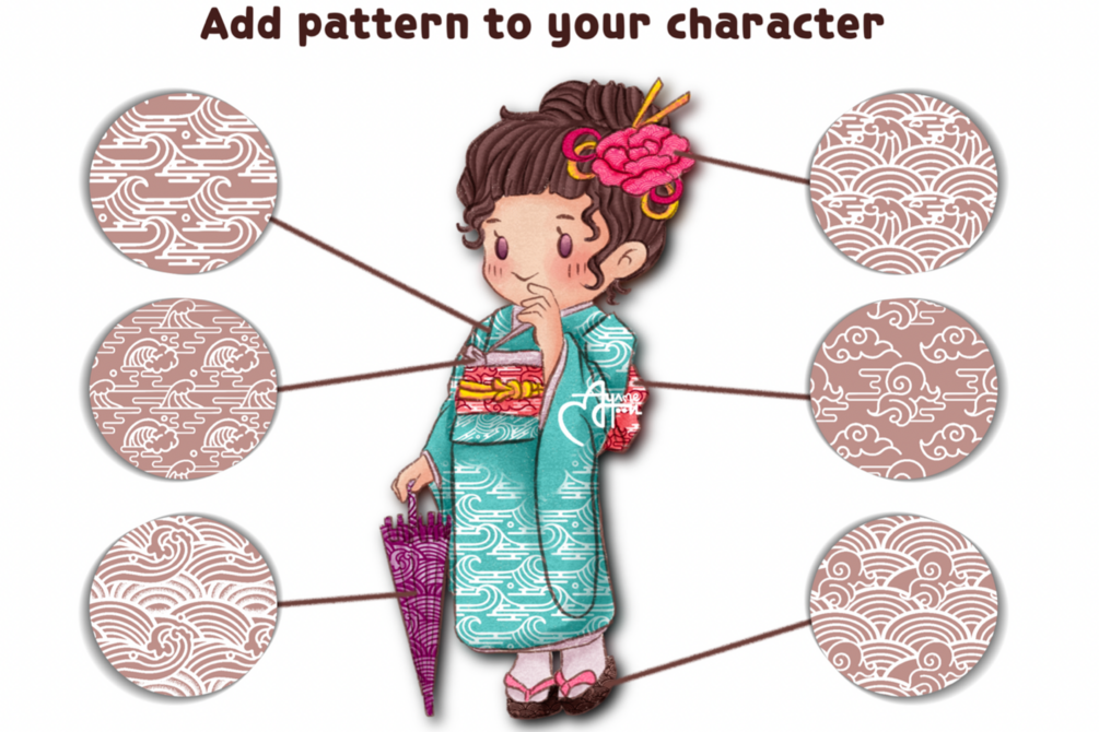 Japanese pattern designed by Ayamehoon into Kawaii brush style inspired by Asian pattern Japanese wave, These Procreate brushes contain 20 different wave patterns adjustable size in high resolution suitable for clothing designs, craft project and character art work
